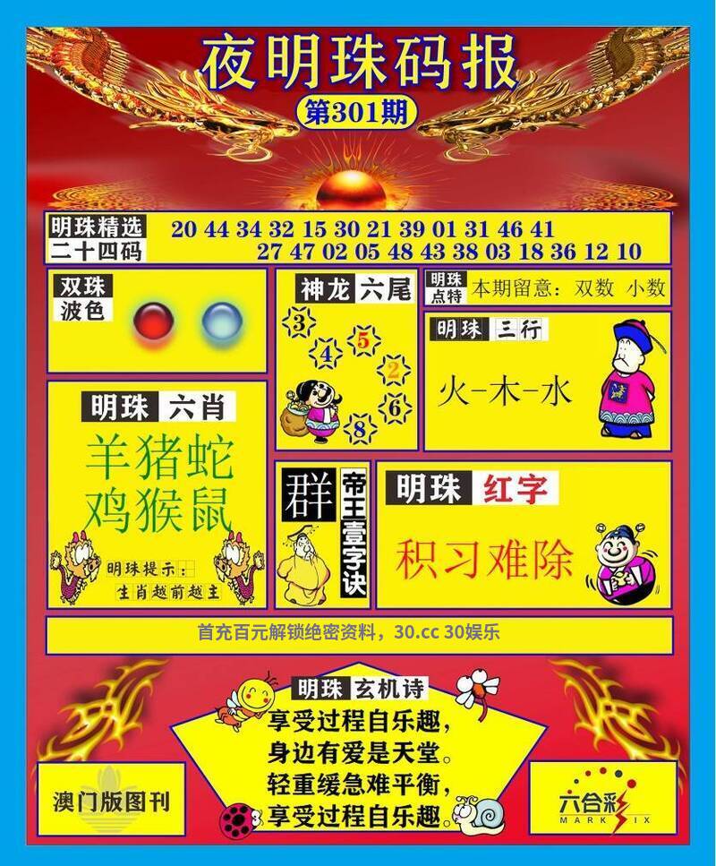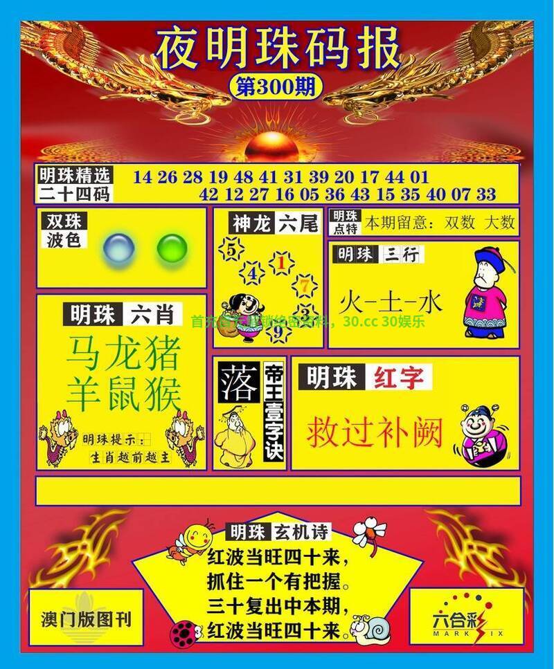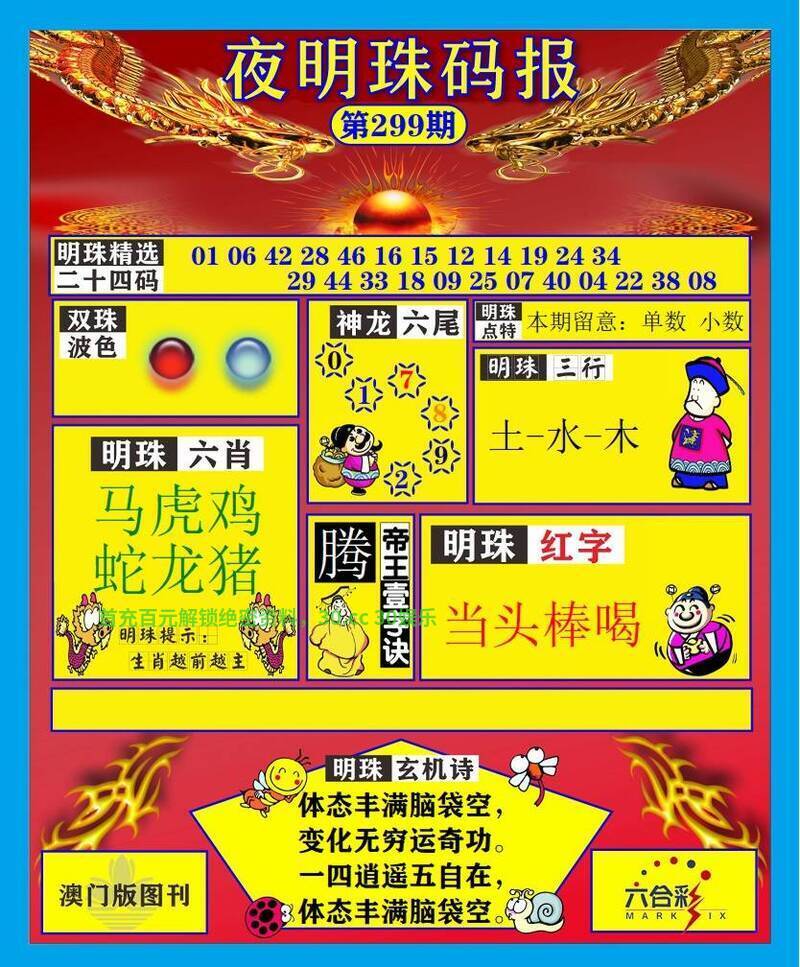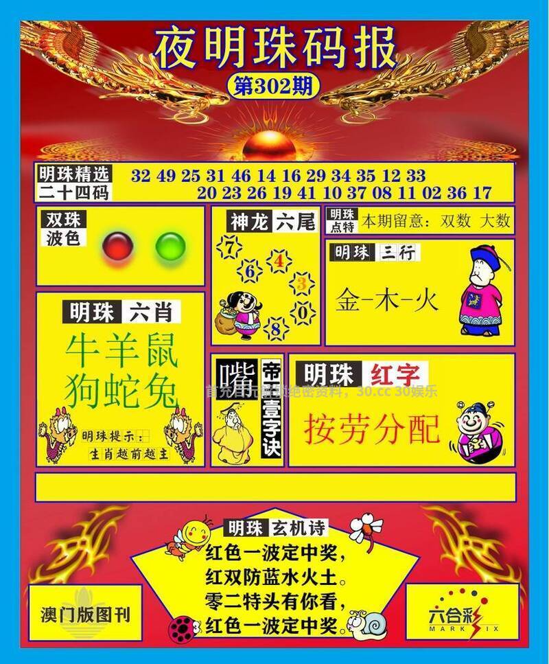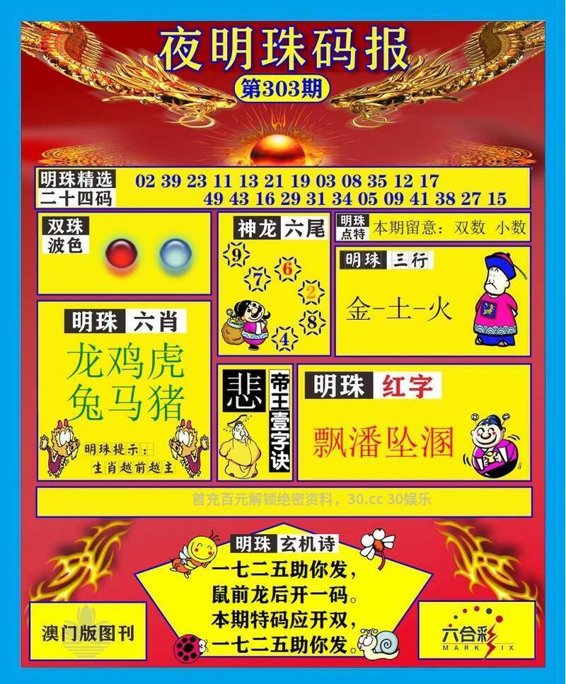 | 303期:玄机诗 一七二五助你发,鼠前龙后开一码。本期特码应开双,一七二五助你发。 精选六肖:龙鸡虎兔马猪 精选六码:26 09 04 15 36 07 |