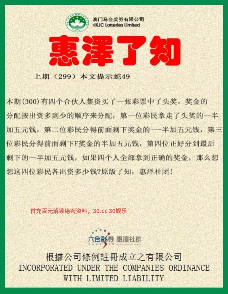 | [惠泽了知] 300期:有四个合伙人集资买了一张彩票中了头奖,合伙解合肖马鼠羊虎牛兔。奖金的分配按出资多到少的顺序来分配,第一位彩民拿走了头奖的一半加五元钱,第二位彩民分得前面剩下奖金的一-半加五元钱,第三位彩民分得前面剩下F奖金的半加五元钱,第四位正好分到最后剩下的一半加五元钱,如果四个人全部拿到正确的奖金,那么想想这四位彩民各出资多少钱? [惠泽九肖]:马鼠羊虎牛兔龙蛇猴 [惠泽六肖]:马鼠羊虎牛兔 [惠泽平肖]:马马马 [惠泽平尾]:4444尾 [惠泽特码]:24 36 06 42 11 47 16 40 05 41 |