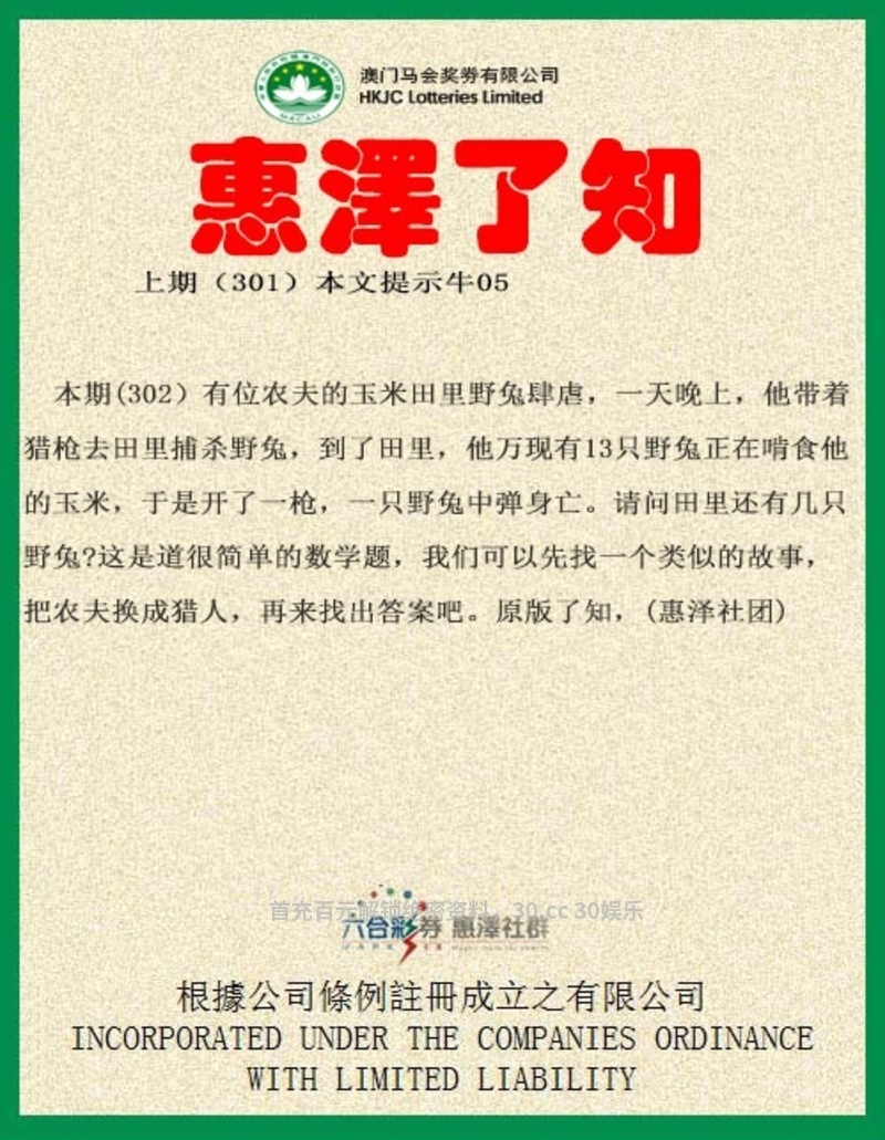 | [惠泽了知] 302期:有位农夫的玉米田里野兔肆虐,一天晚上,他带着猎枪去田里捕杀野兔,解野肖鼠虎兔龙蛇猴。到了田里,他万现有13只野兔正在啃食他的玉米,于是开了一枪,一只野兔中弹身亡。解凶丑鼠牛虎猴狗猪。请问田里还有几只野兔?这是道很简单的数学题,我们可以先找一个类似的故事,把农夫换成猎人,再来找出答案吧。 [惠泽九肖]:兔鼠虎龙蛇猴狗猪马 [惠泽六肖]:兔鼠虎龙蛇猴 [惠泽平肖]:兔兔兔 [惠泽平尾]:5555尾 |